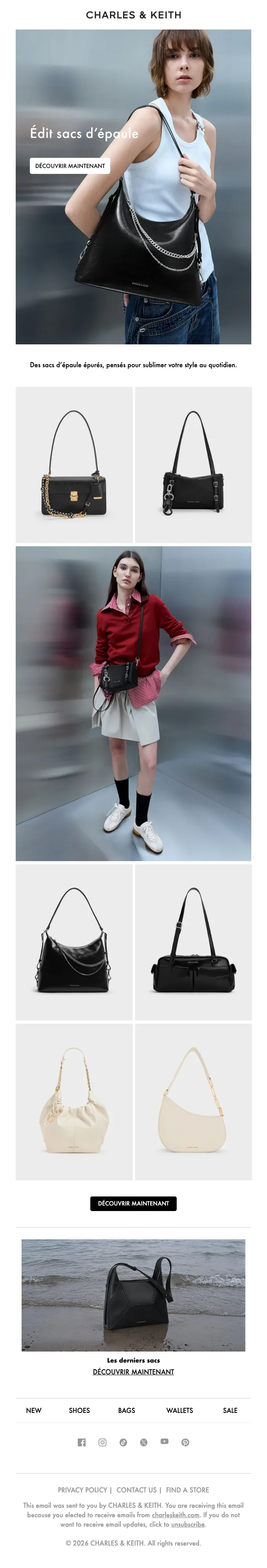 Restez à la pointe de la mode et bénéficiez d'une réduction de 10% en vous abonnant à la newsletter CHARLES & KEITH. C'est l'occasion parfaite pour ajouter une touche d'élégance à votre garde-robe avec des articles de haute qualité. L'offre est valable dès votre inscription et le rabais s'appliquera automatiquement sur votre prochain achat.