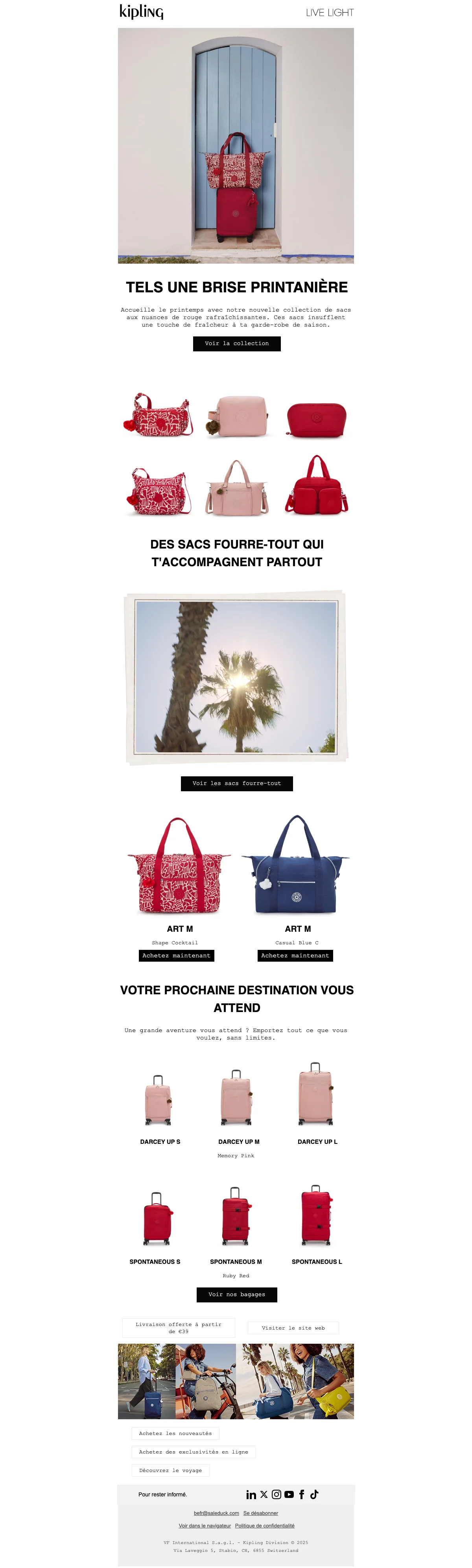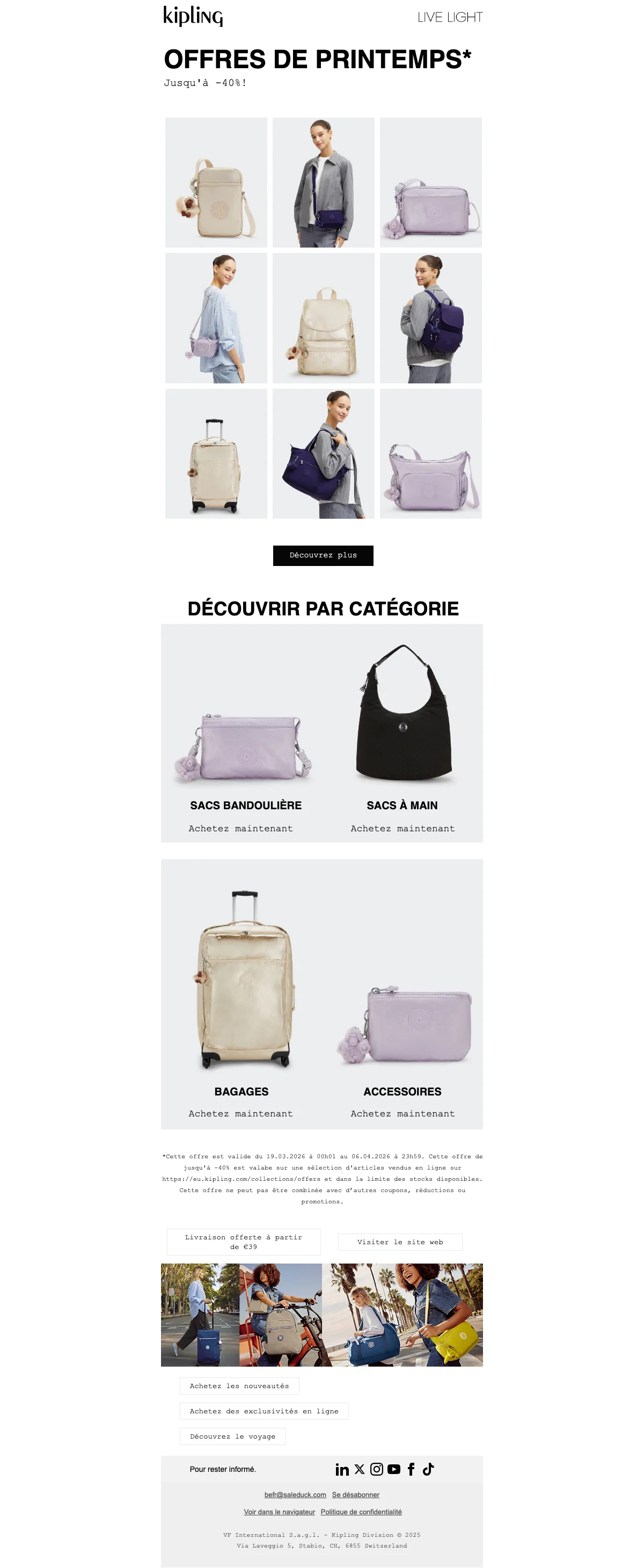 Nous surveillons en continu les offres de Kipling via le site officiel, les réseaux partenaires et les newsletters des boutiques en ligne. Les nouvelles promotions sont contrôlées automatiquement et manuellement afin d’en vérifier la validité.