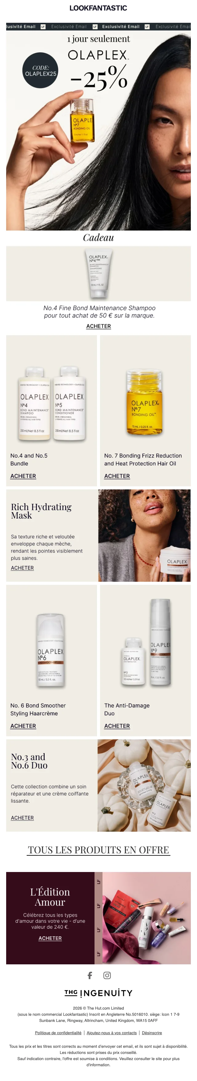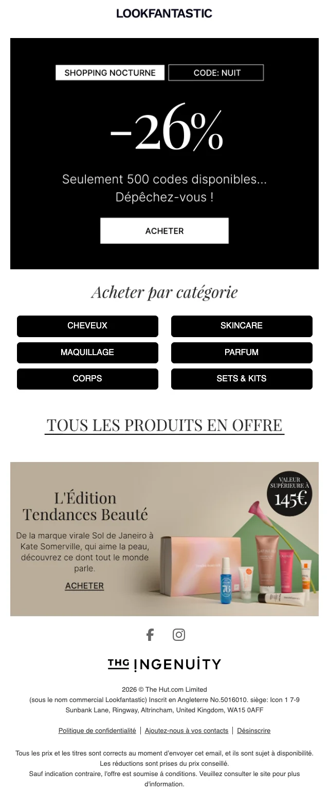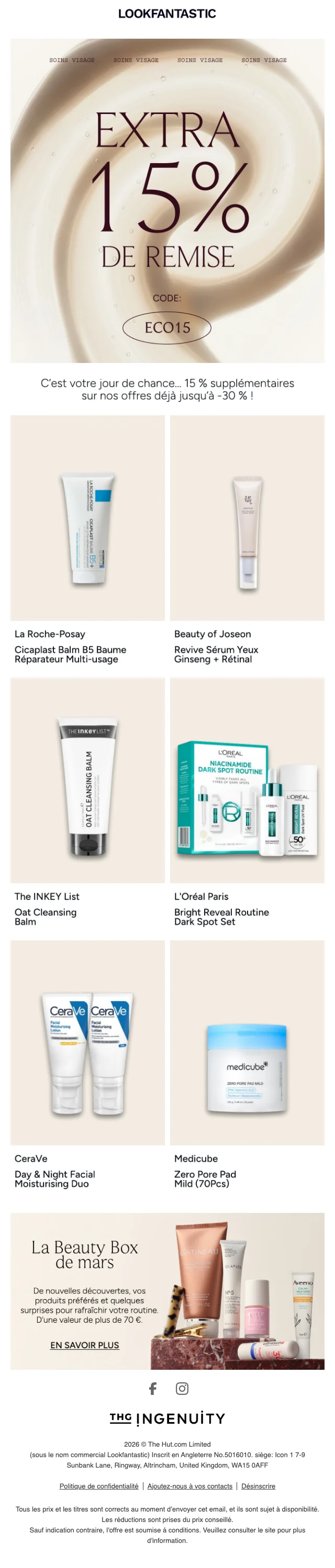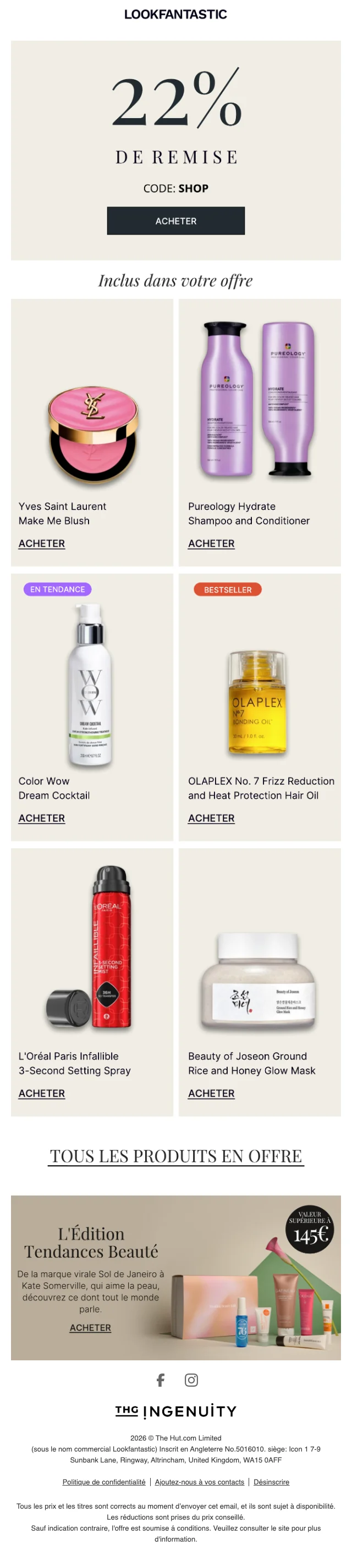 Nous surveillons en continu les offres de LookFantastic via le site officiel, les réseaux partenaires et les newsletters des boutiques en ligne. Les nouvelles promotions sont contrôlées automatiquement et manuellement afin d’en vérifier la validité.