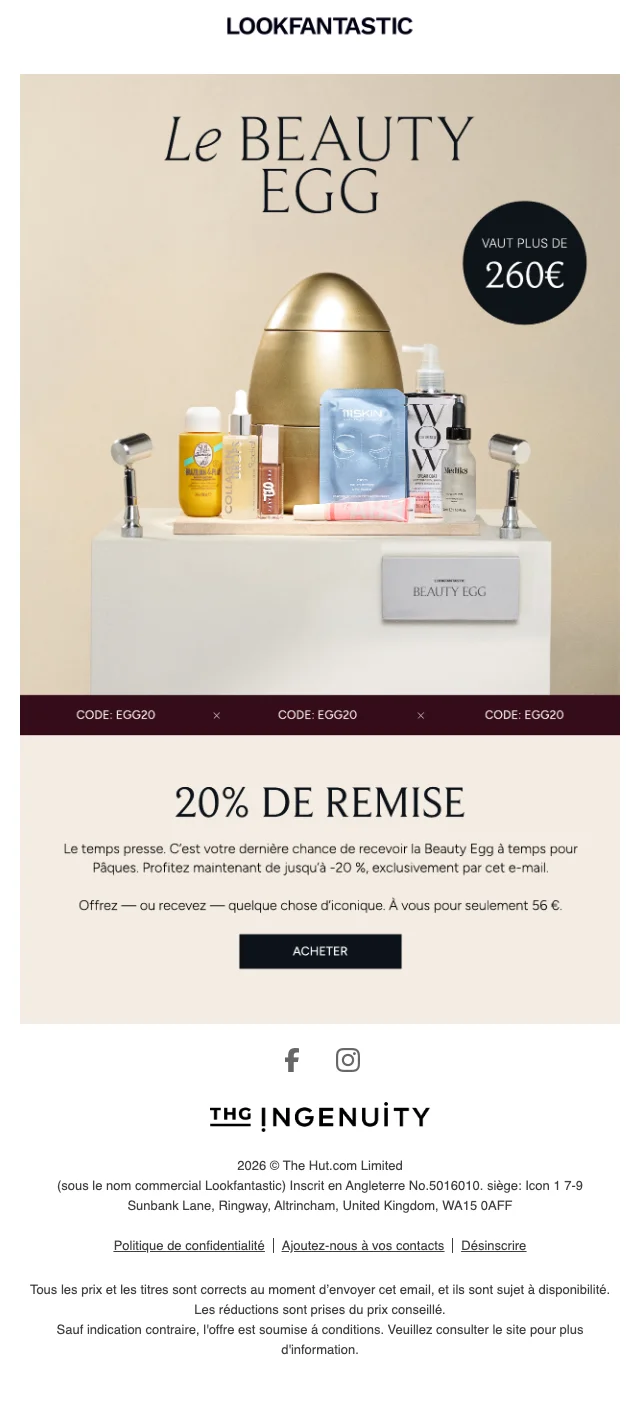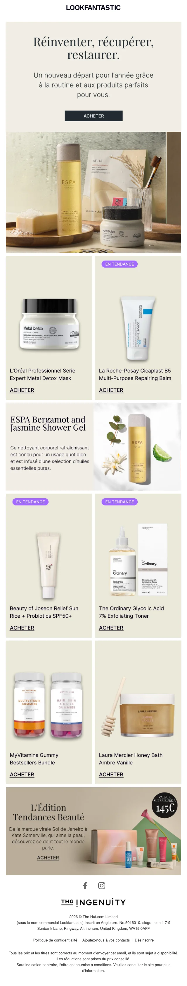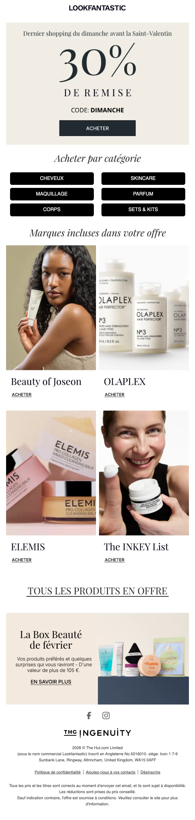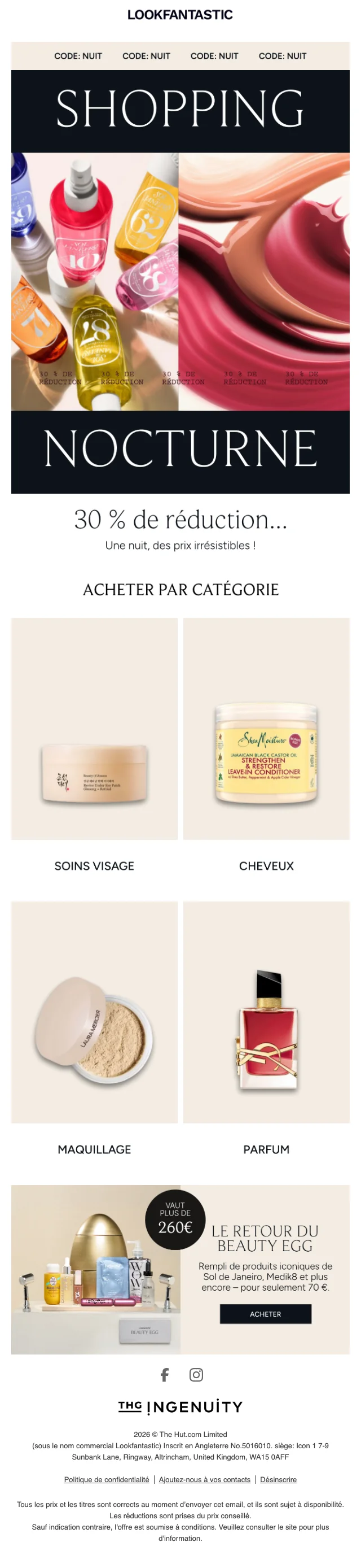 Nous surveillons en continu les offres de LookFantastic via le site officiel, les réseaux partenaires et les newsletters des boutiques en ligne. Les nouvelles promotions sont contrôlées automatiquement et manuellement afin d’en vérifier la validité.