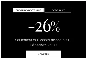 Profite de 26% de remise pendant la shopping nocturne sur une sélection beauté (cheveux, maquillage, parfums et corps). Offre limitée aux 500 premiers codes disponibles ; dépêche-toi avant rupture et consulte le site pour conditions et disponibilité.