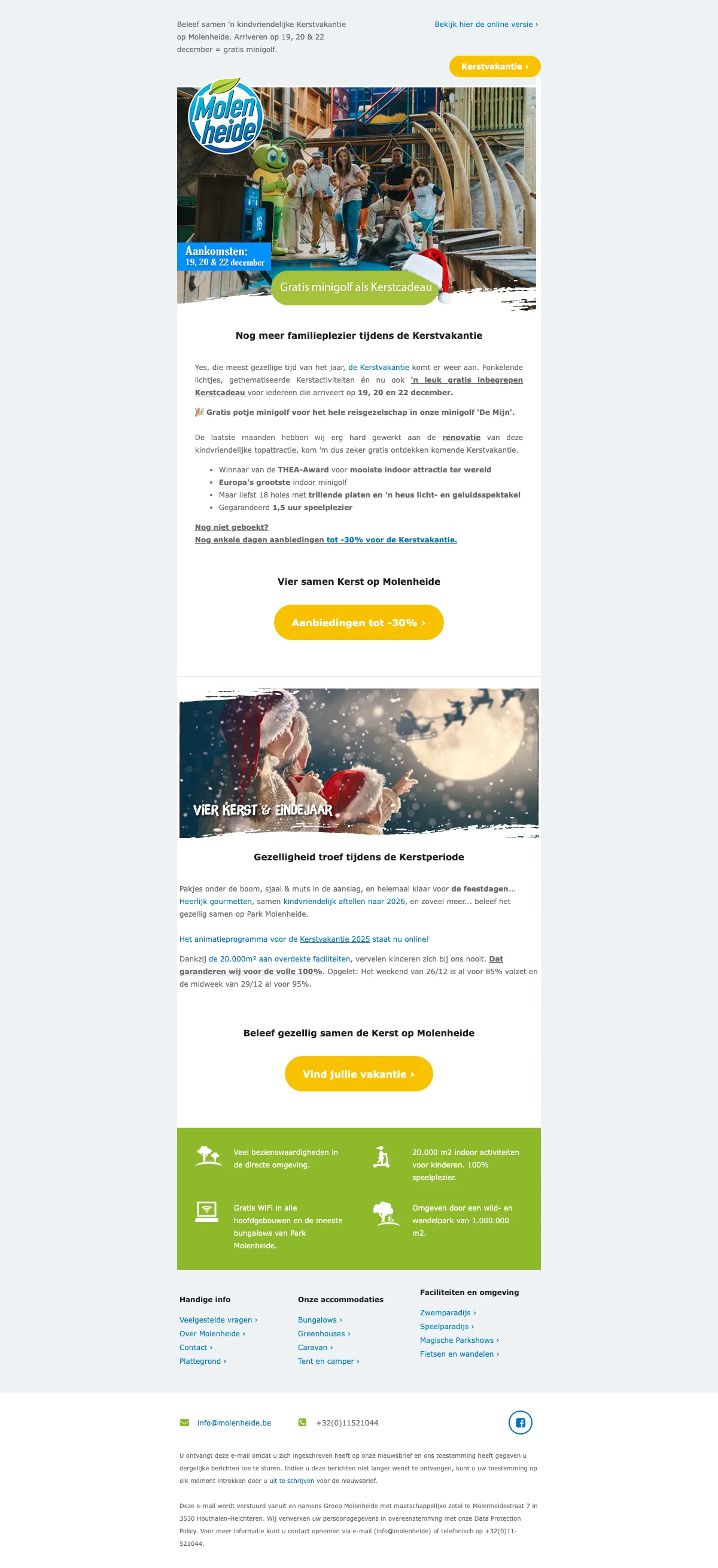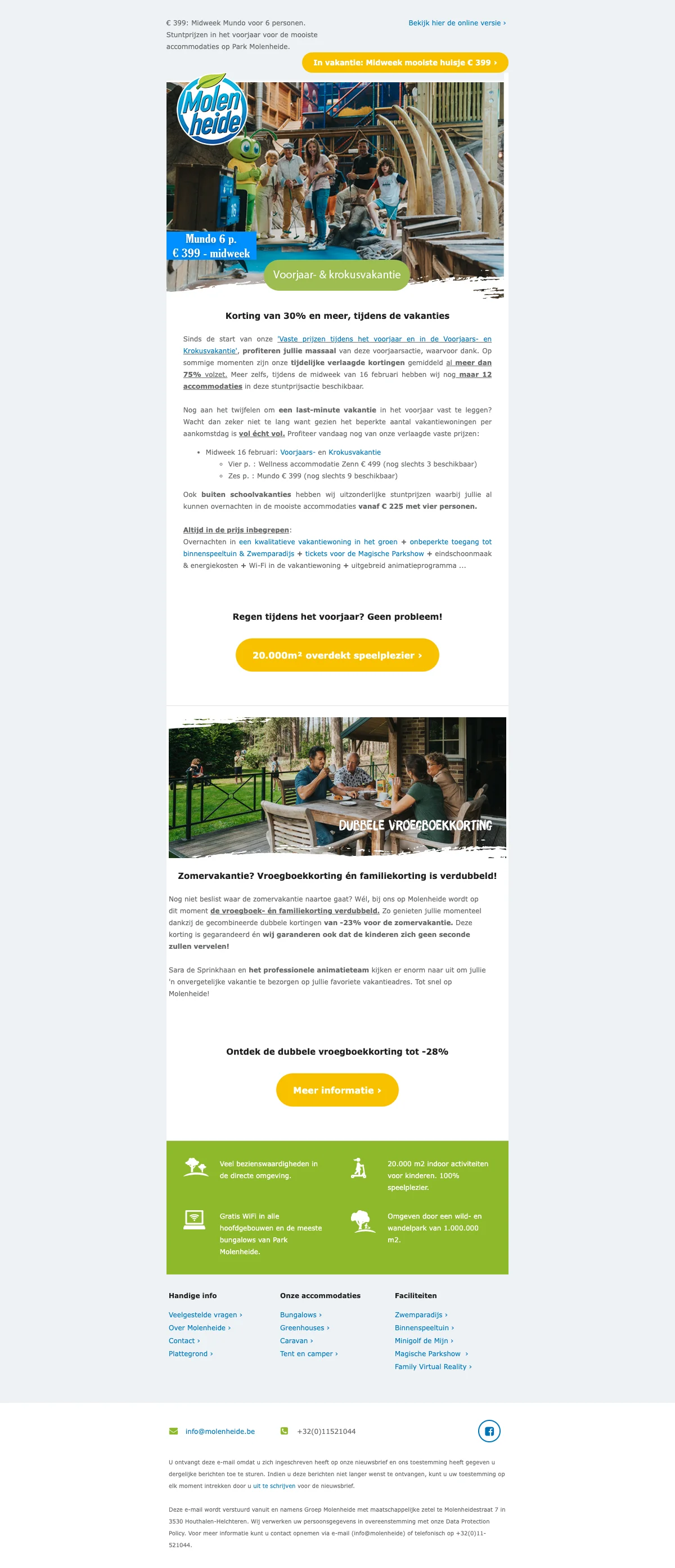 Molenheide.be est le site Web du célèbre parc de vacances Molenheide. Sur Molenheide.be vous trouverez de nombreuses informations sur le parc, y compris les différentes maisons de vacances et campings, ainsi que les activités qui y sont organisées. En utilisant ces informations, vous pouvez parfaitement préparer votre visite à Molenheide en combinaison avec le vaste plan du parc. Enfin, le code promotionnel Molenheide vous offre la possibilité de rendre votre visite moins chère. De cette façon, vous pouvez visiter plus souvent ce magnifique parc bien entretenu avec vos enfants (ou seuls). Alors n'hésitez pas et jetez un coup d'œil sur le site Molenheide.be.
