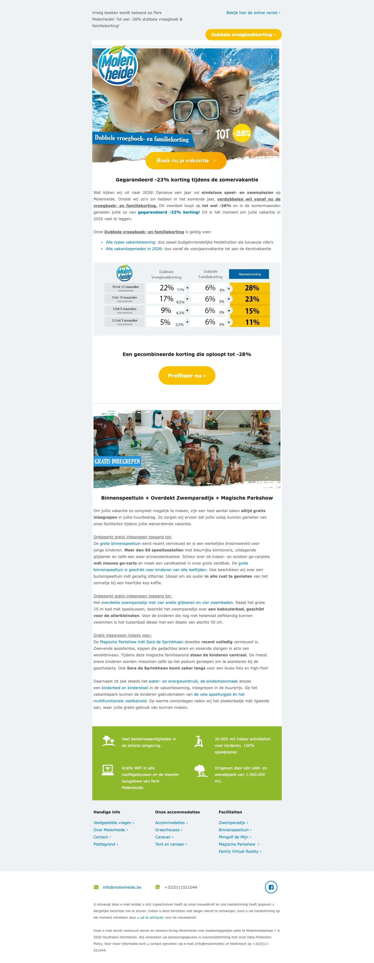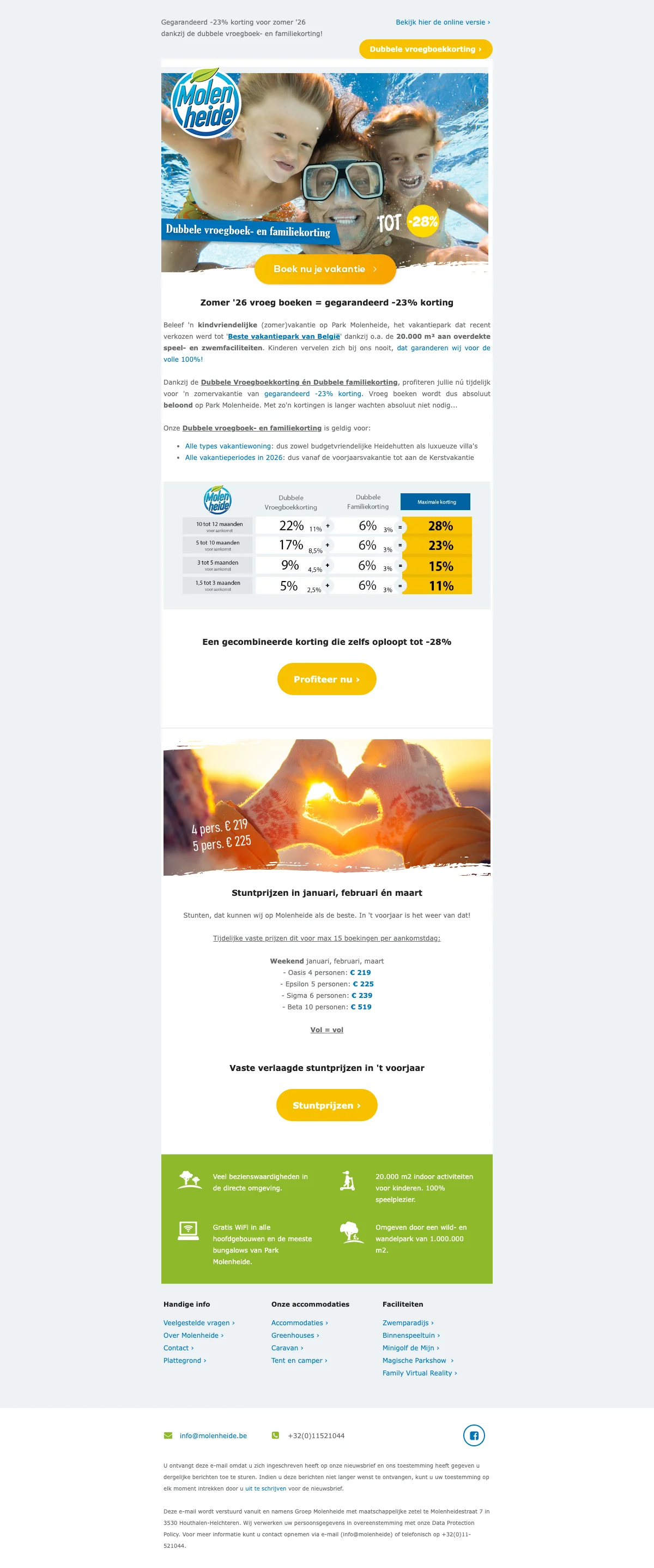 Vous pouvez profiter de diverses réductions à Molenheide. Réservez-vous à l'heure? Ensuite, vous recevrez une réduction pour les lève-tôt. Les jeunes familles et les personnes de plus de 50 ans bénéficient également toujours d'une réduction.