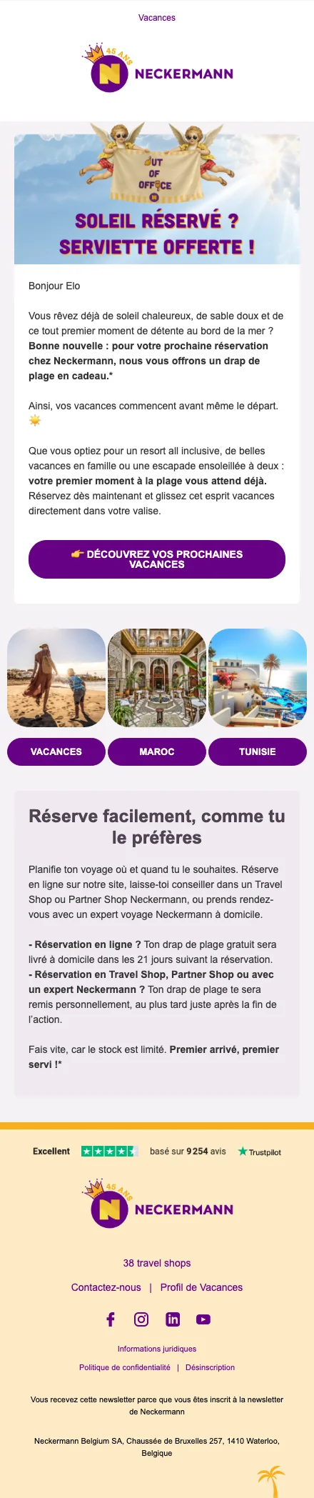 Neckermann est un Tour opérateur appartenant au groupe Thomas Cook et proposant des vacances au prix les plus bas à travers le monde ! Vous souhaitez planifier vos vacances en famille pendant les vacances scolaires 2018 ou partir en vacances last minute ? Partir dans un hôtel avec un bon rapport qualité/prix ou trouver des billets d'avion pas chers ? L'agence de voyages Neckermann vous propose un éventail de vacances à des prix très compétitifs ! Neckermann est la référence pour vos vacances pas chères et a d'ailleurs reçu l'Award du meilleur webshop travel de 2015 ! Neckermann possède actuellement 86 boutiques de vacances à travers la Belgique pour répondre à toutes vos envies d'ailleurs. Que vous vouliez réserver des vacances au ski, des vacances soleil ou encore un voyage de noces, vous trouverez ce qu'il vous faut sur le site Neckermann !