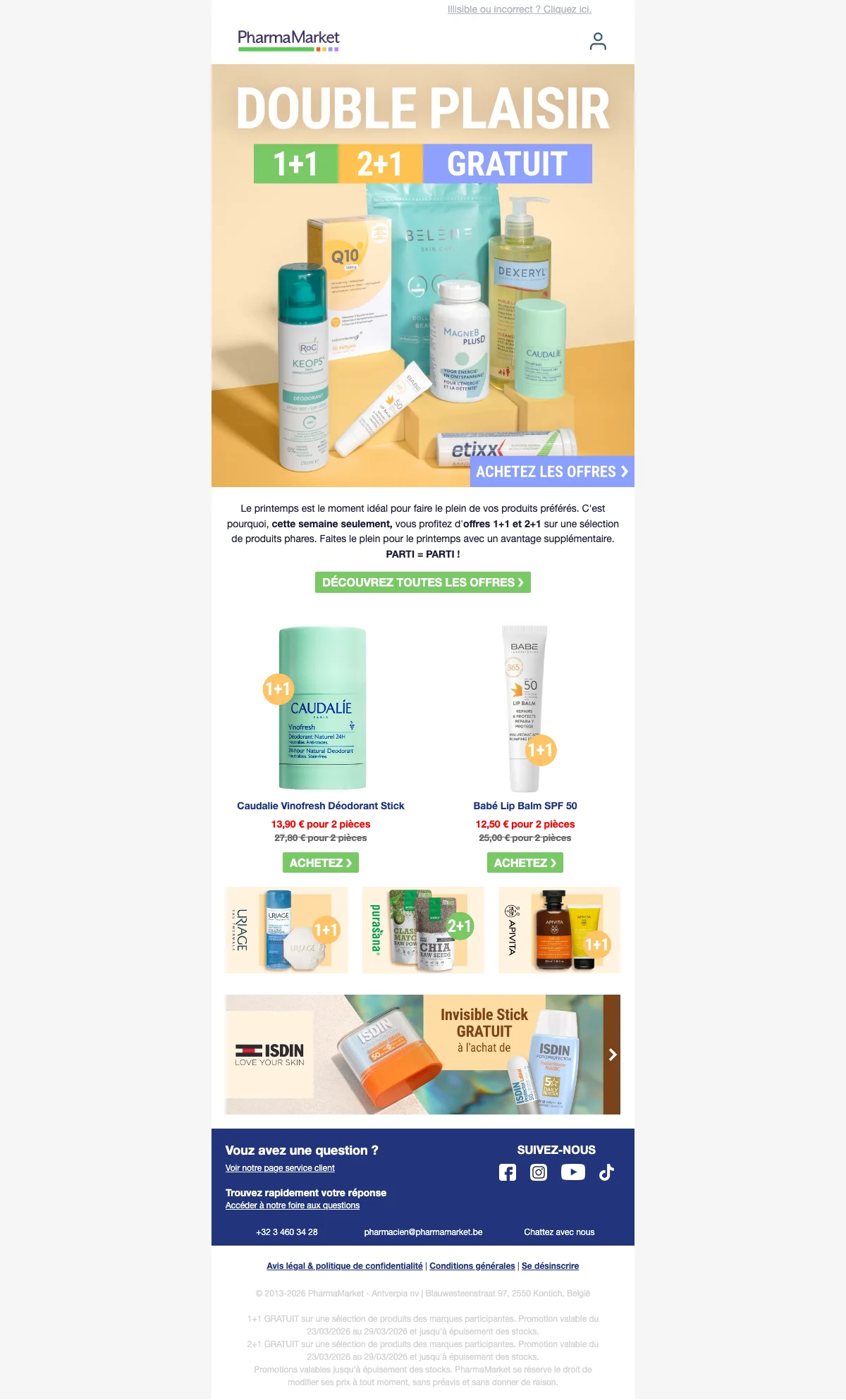 PharmaMarket 1+1 gratuit et 2+1 gratuit sur sélection beauté printemps