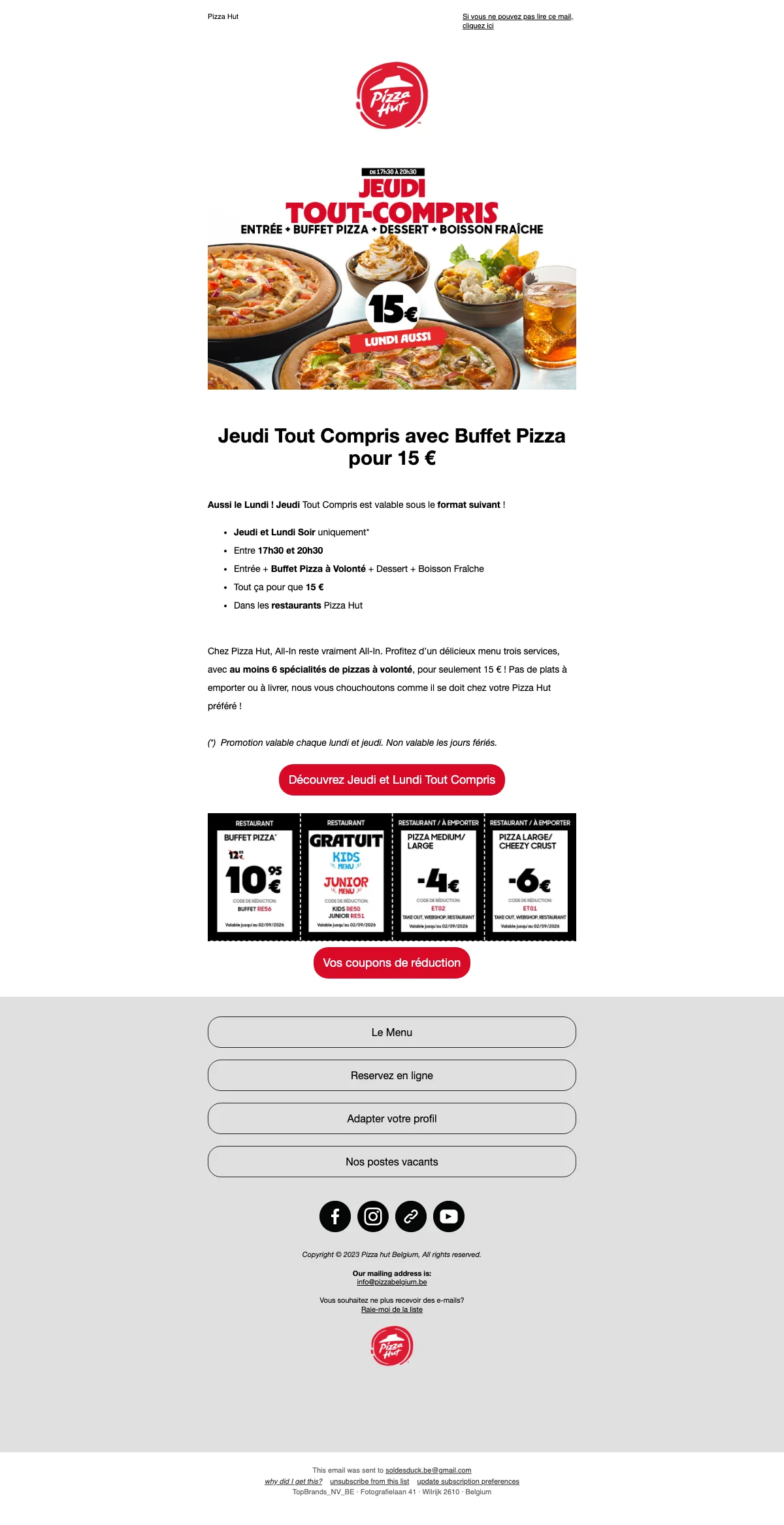 Viens chez Pizza Hut pour profiter d'un buffet pizza à volonté pour seulement $15 ! Ce menu tout compris inclut une entrée, un buffet de pizzas, un dessert et une boisson fraîche. Offre disponible uniquement sur place chaque lundi et jeudi soir.