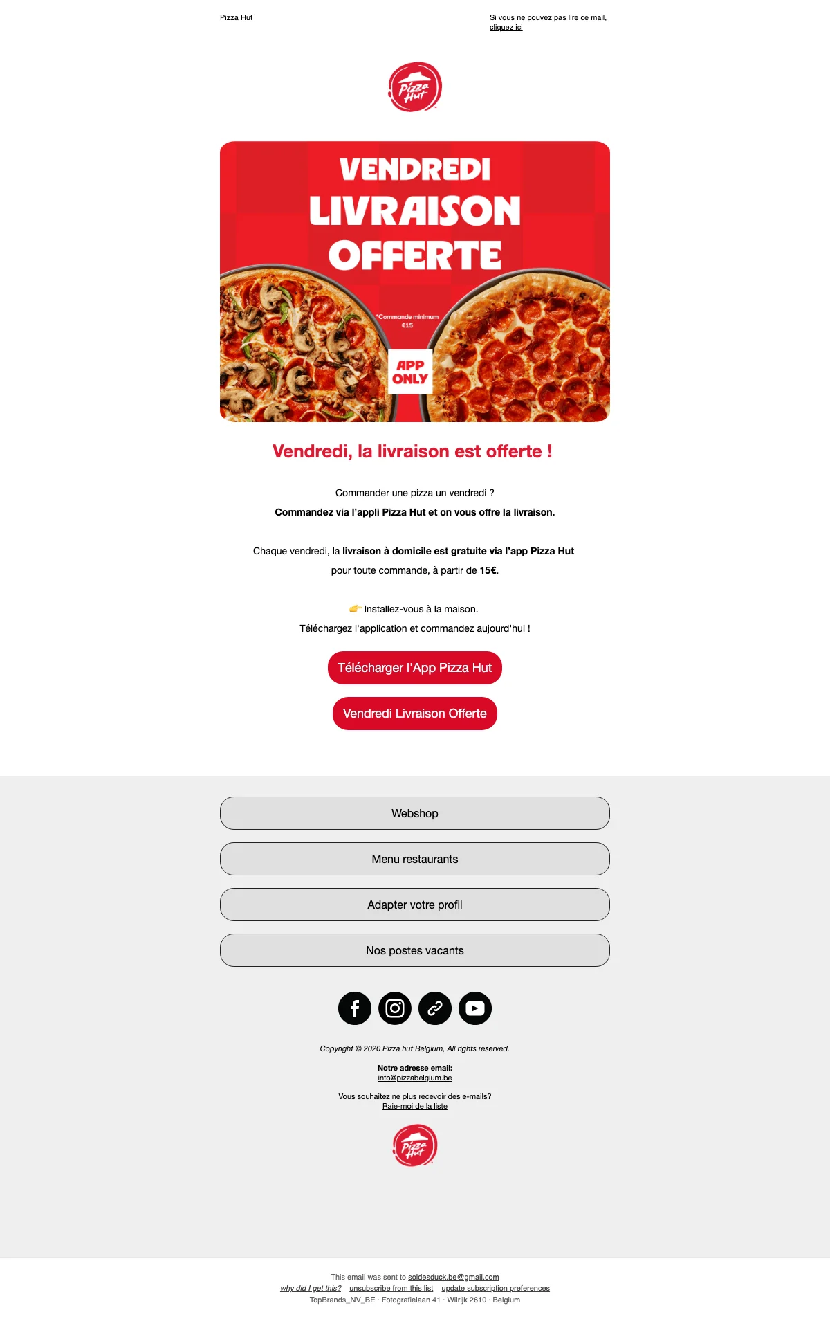 Pizza Hut livraison gratuite chaque vendredi pour commandes dès 15 €