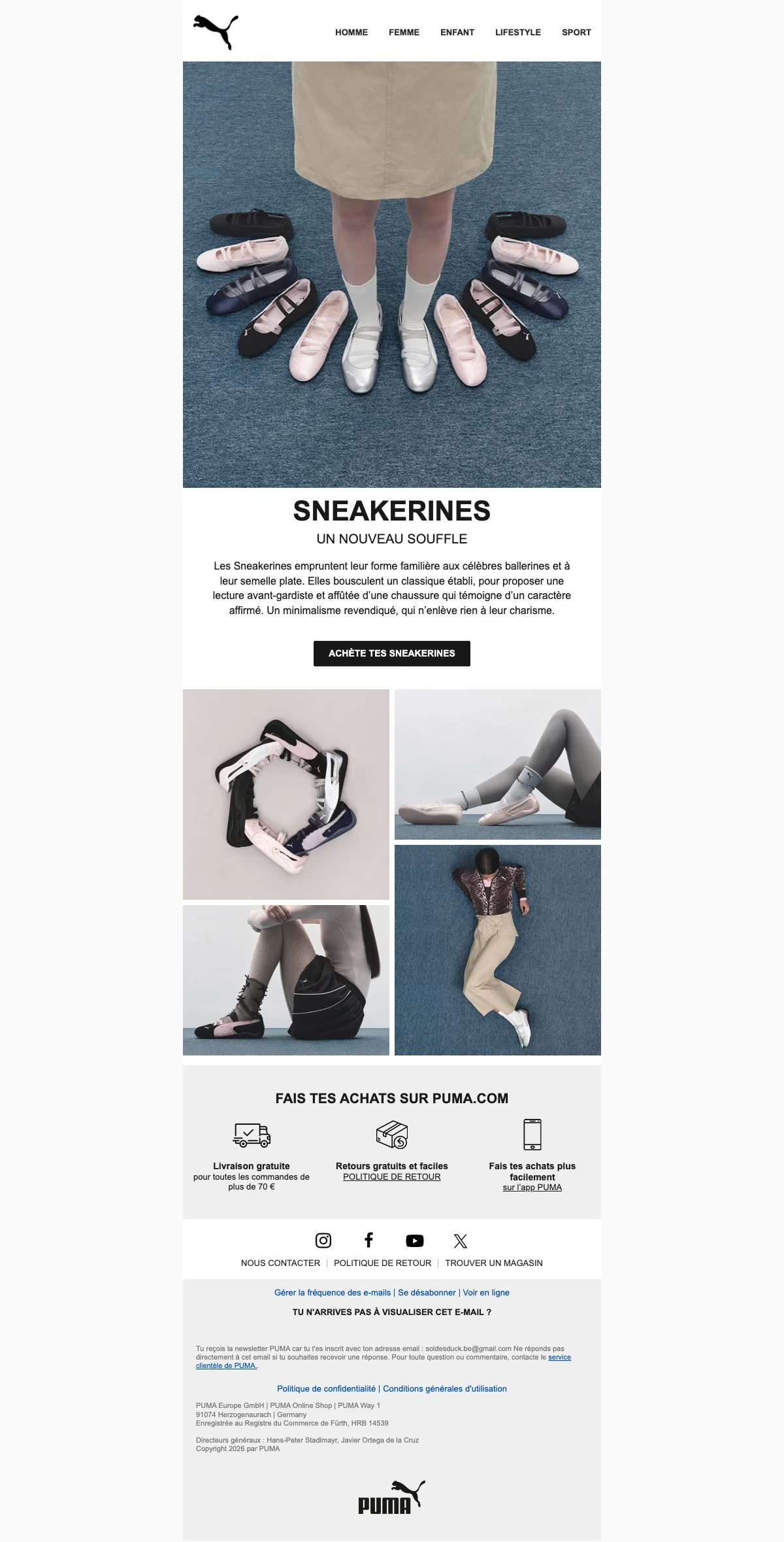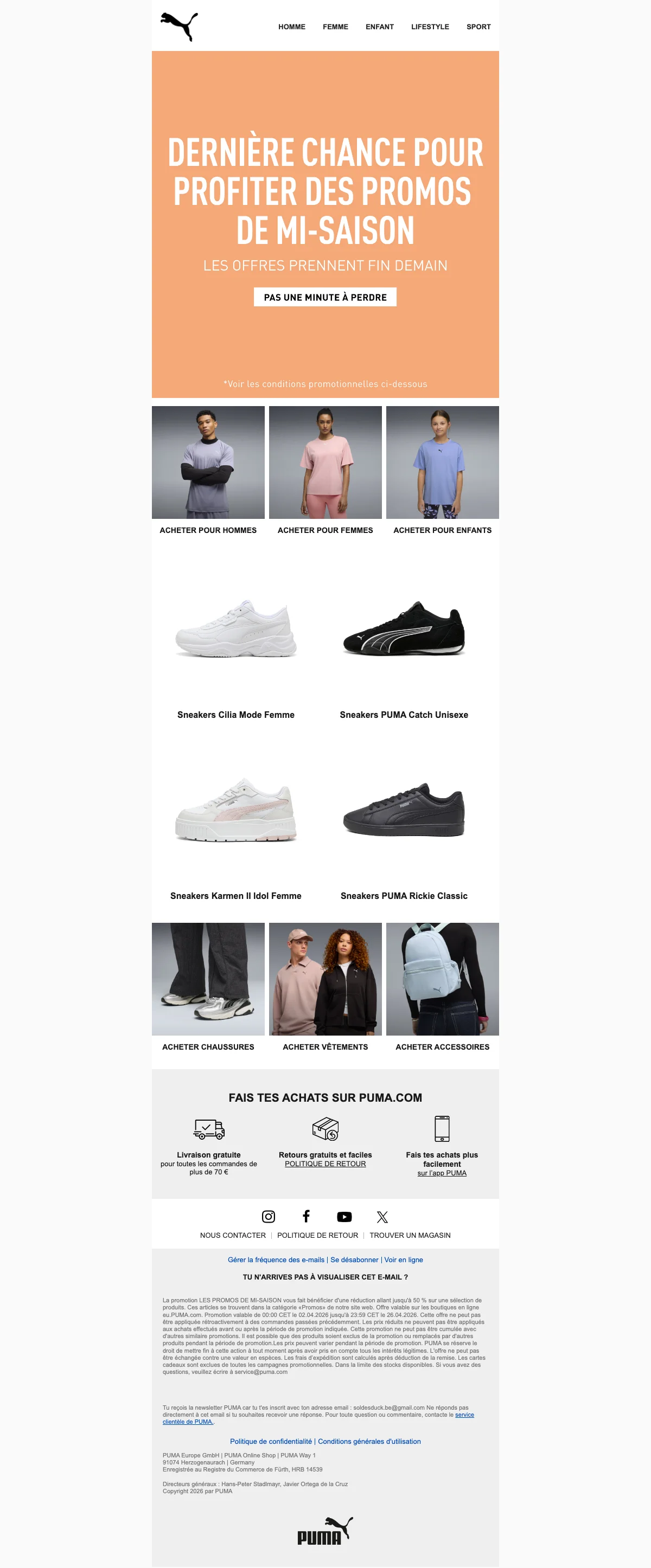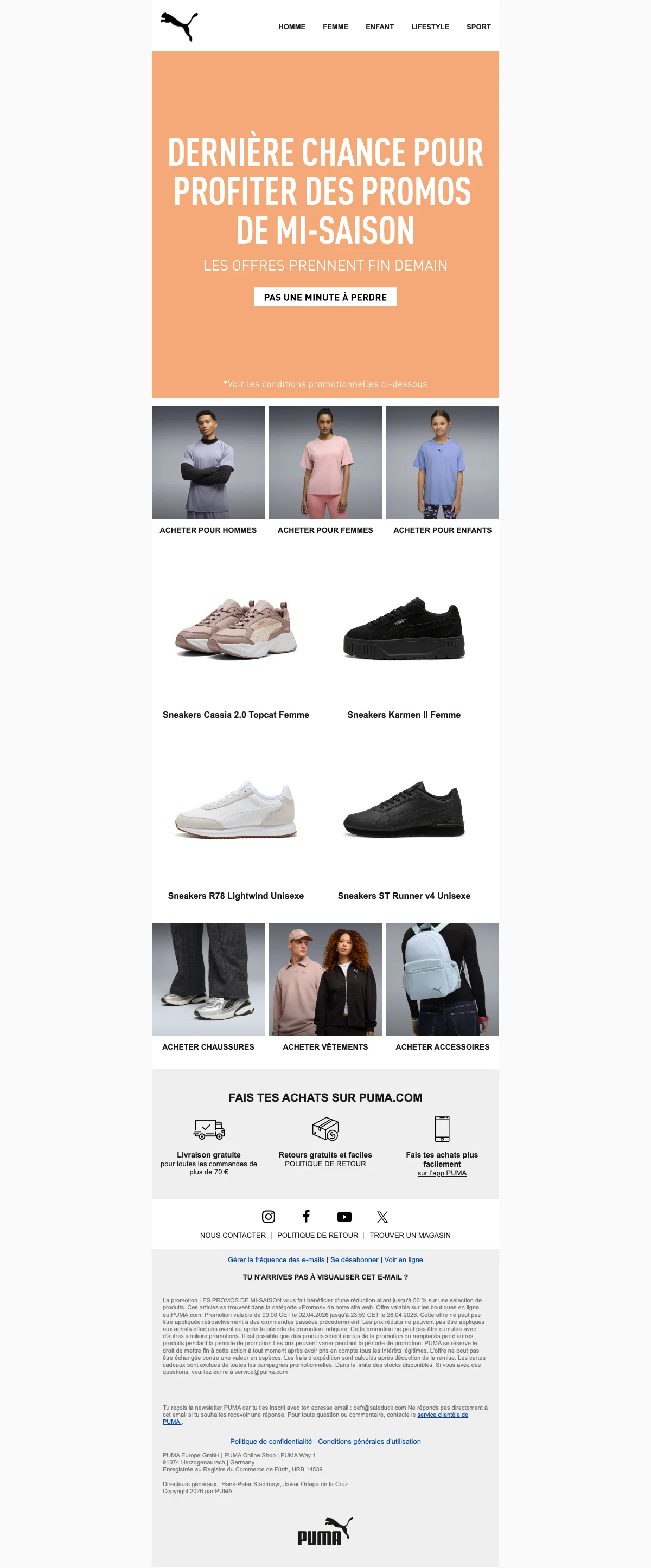 Sur la boutique en ligne, vous pourrez retrouver toutes les paires de chaussures de la marque : des crampons aux classiques modèles Clyde, ou encore des emblématiques Suede aux Creepers ultra tendances… Les collections de sneakers de la marque se suivent mais ne se ressemblent pas, et on en trouve pour tous les styles et pour tous les sports, dans toutes les tailles. Du football, à l'athlétisme, en passant par la course à pied et même le golf, tous les sports seront représentés par la marque. Il existe même une collection RedBull et Ferrari, dédiée aux sports motorisés.