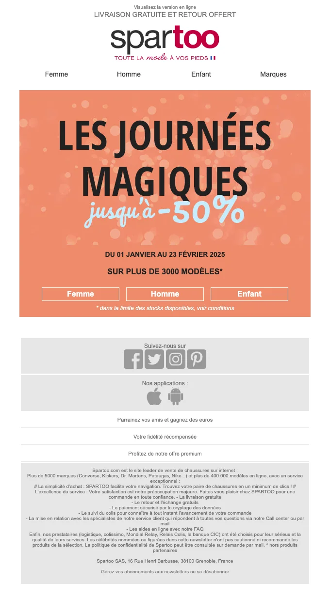 Chez Soldesduck, nous avons pour mission de recenser et de mettre à votre disposition les meilleurs codes promo et offres Spartoo sur cette page. En nous rendant visite fréquemment, vous êtes ainsi assurés de faire des économies tout au long de l'année. Vous pouvez aussi souscrire à notre newsletter et recevoir notre sélection d'offres et bons plans directement dans votre boîte mail, facile, non ? Et puis, nous n'oublions pas les deux périodes de soldes Belgique : soldes hiver {{ date:year }} en janvier et soldes été {{ date:year }} en juillet. Durant ces périodes, vous ne manquerez pas de faire de nombreuses économies grâce à notre aide. Vous trouverez facilement votre bonheur parmi de nombreuses soldes chaussures ainsi que des soldes vêtements. Alors c'est parti pour un shopping 100% plaisir !