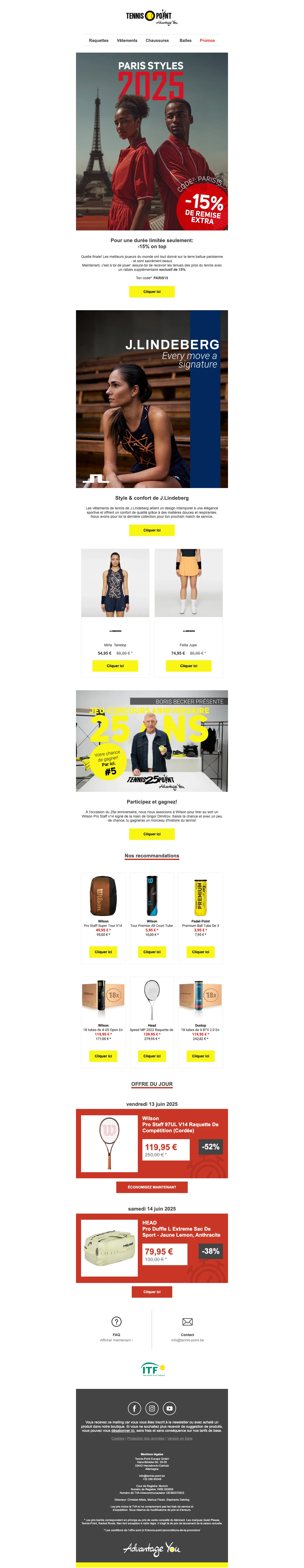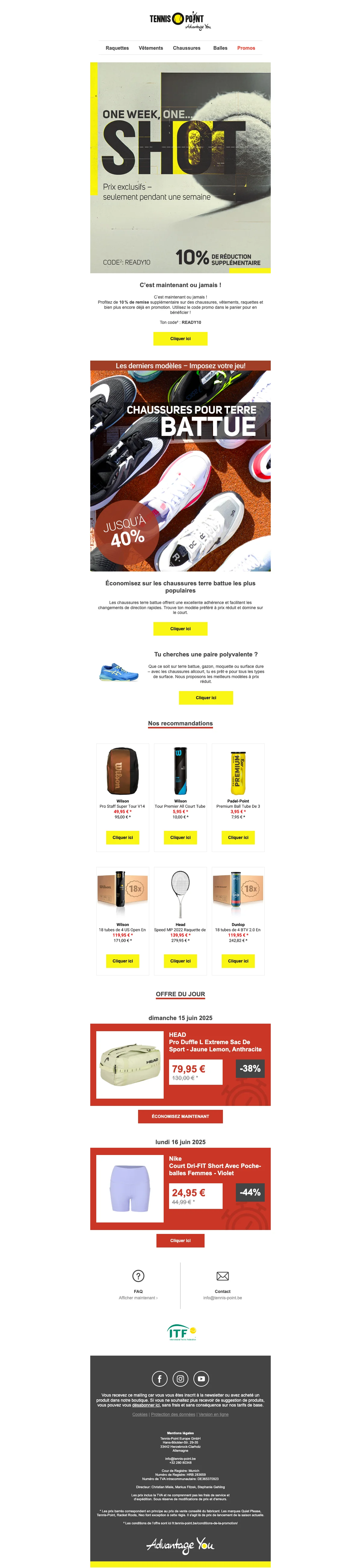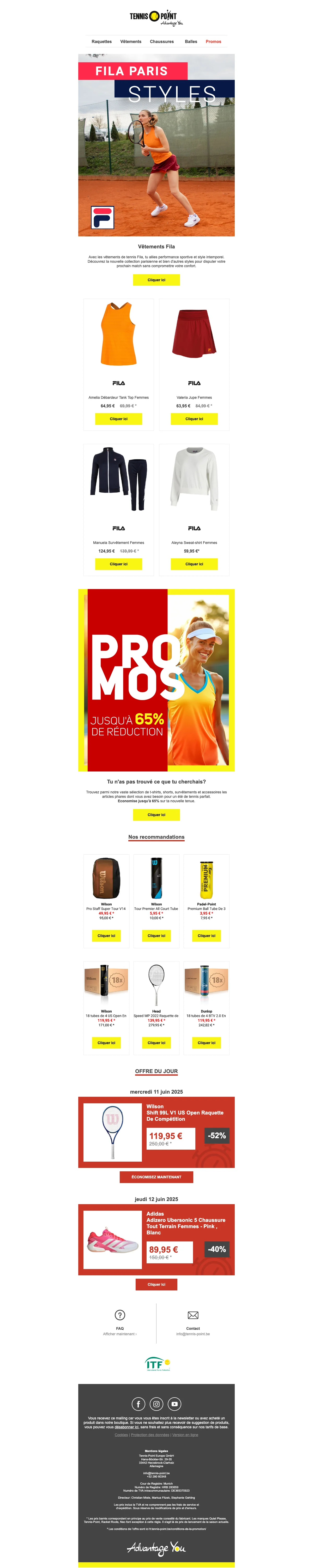 Et pour profiter d'encore plus de promotions et réductions, ne manquez pas les soldes été {{ date:year }} ! Comme chaque année pendant les soldes Tennis-Point, vous trouverez à coups sûrs une paire de baskets Nike en soldes ou un survêtement Adidas en soldes ! Alors profitez vite des soldes Tennis-Point été {{ date:year }} !