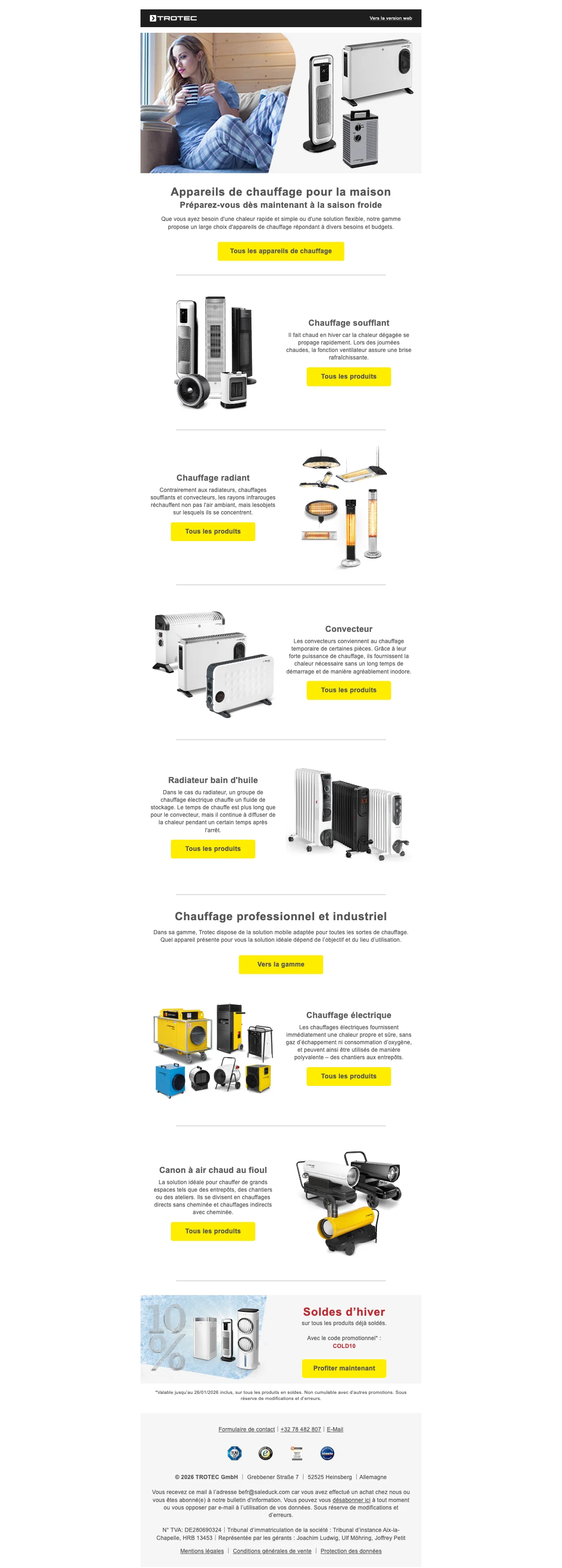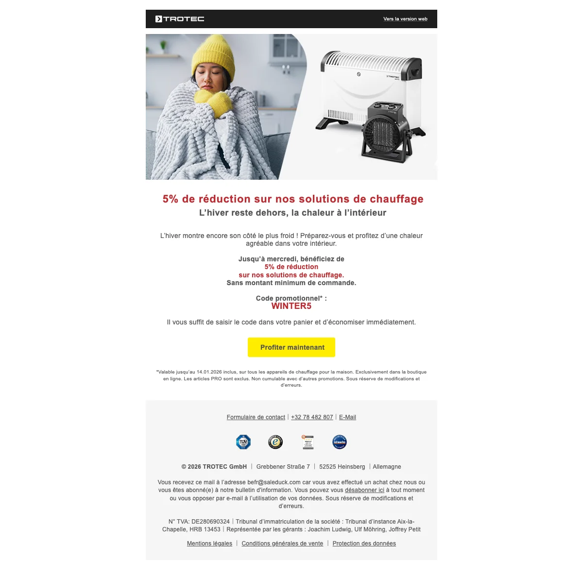Saleduck est un service de comparaison de codes promo indépendant. Le financement de ce service est assuré par la publicité des offres relayées sur ce site. En effet, les offres qui apparaissent sur ce site proviennent d’entreprises dont Saleduck reçoit une rémunération. Cette rémunération peut avoir un impact sur la manière dont les codes promo ou les produits apparaissent sur ce site, y compris, par exemple, leur ordre d’apparition dans les catégories. Saleduck a des contrats en direct avec les annonceurs dont nous faisons la promotion. Nous publions uniquement les codes promo que nous obtenons directement de l'annonceur ou si l'annonceur en fait lui-même la promotion. Nous ne republions pas de codes promo provenant d'autres sites. Saleduck vérifie manuellement les codes promo avant de les publier.