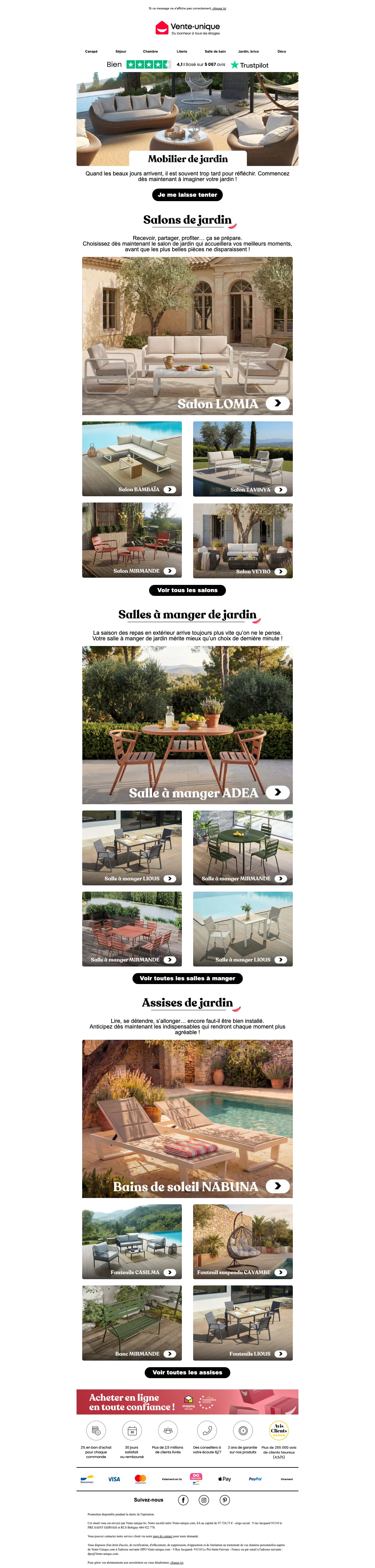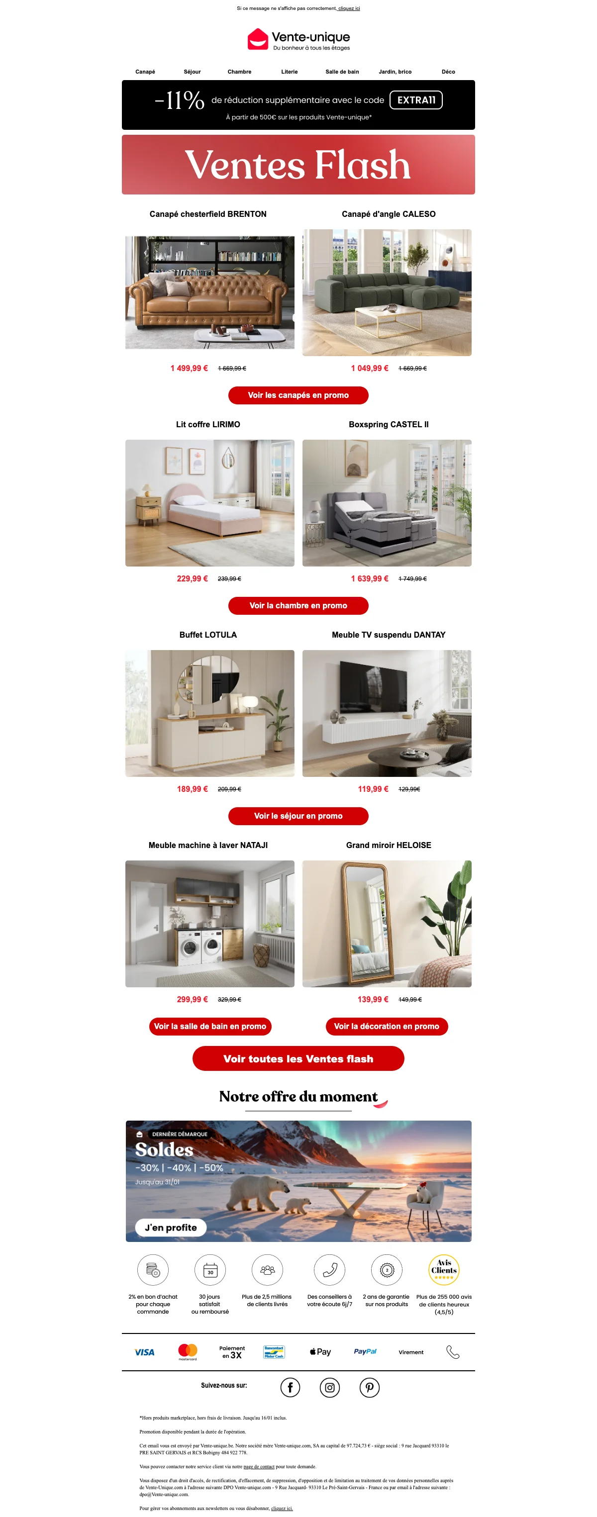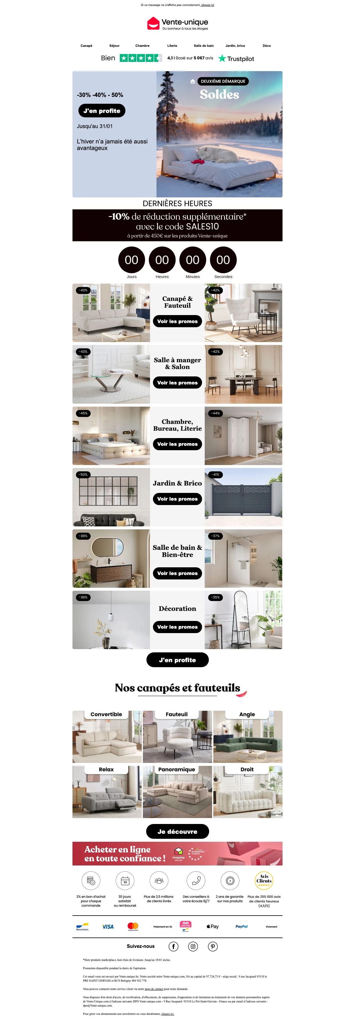Profite de 10% de réduction dès 400€ d'achat sur les produits Vente Unique. Idéal pour économiser sur les gros achats sans conditions complexes.